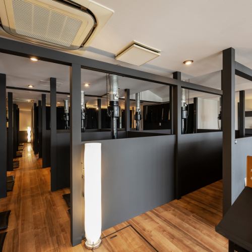 落ち着いたシックな空間が広がる店内は、黒を基調としたスタイリッシュな内装が印象的。ゆったりとした時間が流れる雰囲気で、デートや家族での食事はもちろん、静かに食事を楽しみたい方にもぴったり。焼肉の香りが立ちのぼる中、気兼ねなく会話ができる心地よい距離感の席配置が魅力です。