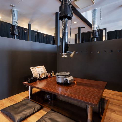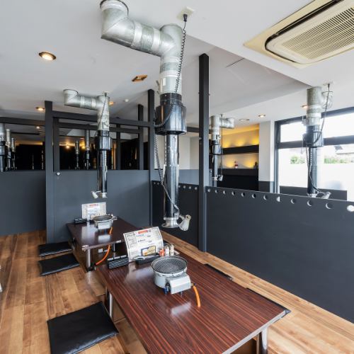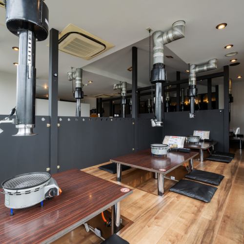 掘りごたつ式のテーブル席は、足を伸ばしてくつろげるのが嬉しいポイント。焼肉ロースターが設置されており、自分のペースで焼きながら食事が楽しめます。友人同士やファミリーでの利用にもおすすめです。
